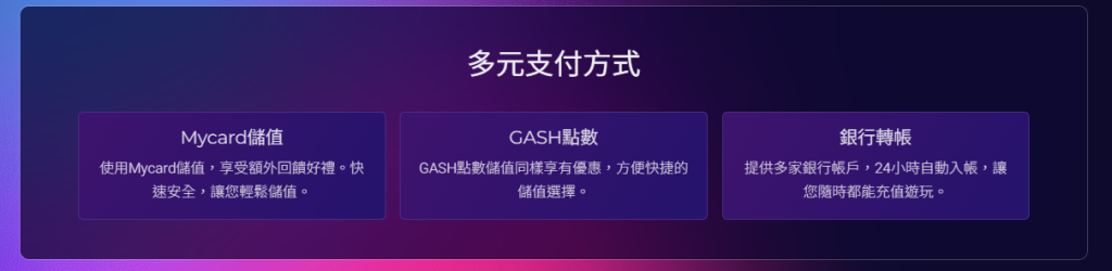透過MyCard或GASH點數即可快速完成加值,無需繁瑣的帳號認證或信用卡授權,適合每日參與任務與登入活動的使用者。