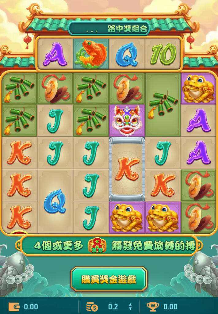 《RSG電子-聚寶財神》是一款以東方財神主題為核心的五輪老虎機遊戲,畫面中充滿吉祥物圖騰,包括鯉魚、金蟾、舞獅、鞭炮等傳統象徵,搭配A、K、Q等撲克牌字母符號,整體視覺風格熱鬧又充滿喜氣,帶有濃濃的中國年節氛圍。