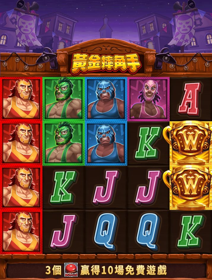 《黃金摔角手》是RSG電子推出的一款充滿趣味與動感的格鬥風格老虎機,整體畫面採用濃厚墨西哥摔角主題,彩色摔角選手作為高分圖示,每個角色外型鮮明、表情張力十足,盤面彷彿置身擂台邊緣,帶給玩家極強的視覺衝擊與娛樂感。
