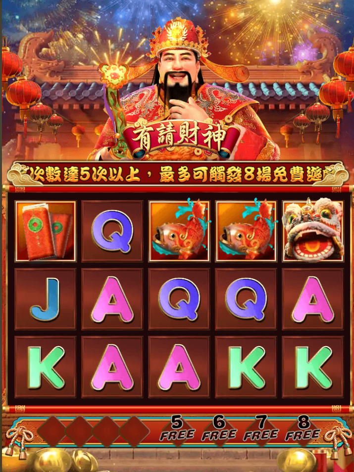 《有請財神》是RSG電子推出的中國風財神主題遊戲,畫面一打開就能看到一身紅袍、笑容滿面的財神爺坐鎮畫面中央,喜氣洋洋的背景搭配煙火與燈籠,加上獅子、金魚、紅包等吉祥圖騰,整體視覺充滿年節氛圍,光是畫面就讓人心情很好。