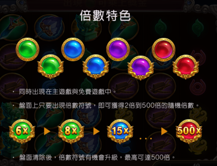 - 免費遊戲倍數爆發:免費遊戲模式下,倍數符號的出現率與升級率明顯提升,且多個倍數符號同時出現的機會大幅增加,這也是許多玩家願意購買免費遊戲的主要原因之一。