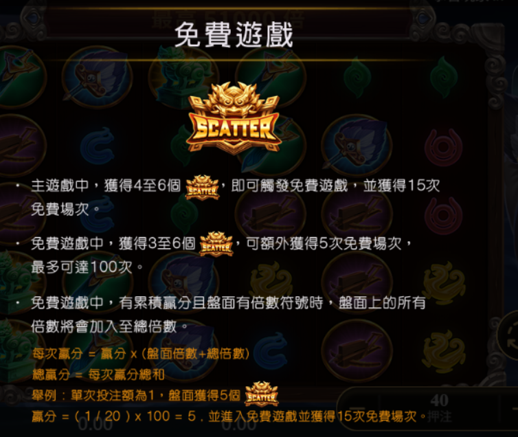 - 出現4至6個SCATTER:即可啟動免費遊戲模式,並立即獲得15次免費場次。