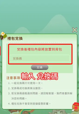 在活動介面中,你會看到一個叫做「背包」的欄位,這是所有玩家領取過的禮包、序號道具的儲存處。點進「背包」後,會出現一個輸入框,上面寫著「兌換禮包代碼的內容將放置到背包」。