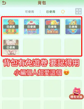 當你兌換完成後,對應的道具就會出現在背包內。若你兌換的是「遊戲免遊卷」,系統會顯示出卷軸圖示,點擊後可選擇「使用道具」,並跳轉到指定遊戲進行免費遊戲10轉。這一點很重要,因為很多玩家以為序號輸入完就結束,其實還要到背包主動啟用,才能真正領到獎勵。