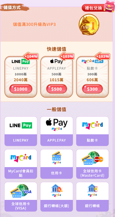 1. 第一筆儲值走Apple Pay/LINE Pay快速通道:觸發首儲100%加碼,同時拿到立即回饋金幣。