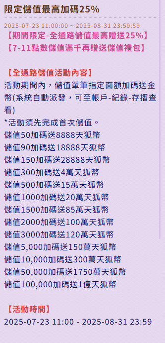 從官方活動可見,《天狐宴儲值》主打各種優惠回饋結構:首儲100%金幣加倍、每日儲值額外贈送天狐幣、7-11 MyCard儲值最高25%加碼等,這些設計無疑是對玩家消費行為的一大激勵。