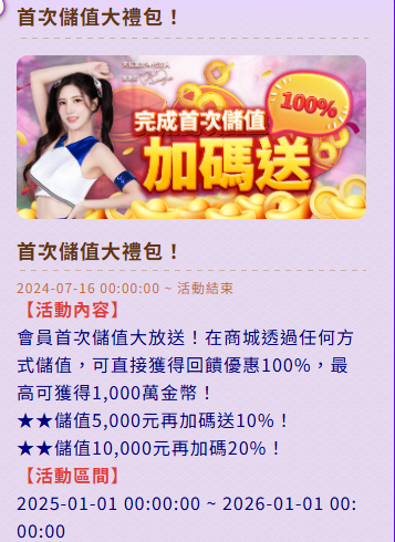 • 儲值滿10000元可再獲得20%獎勵