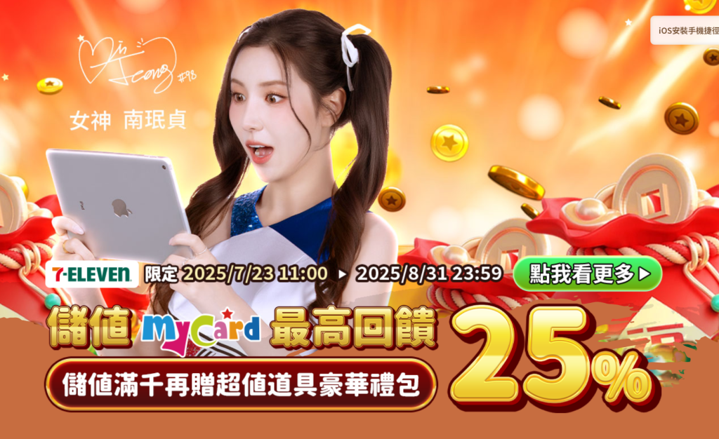 2. 第二階段透過MyCard實體卡儲值:疊加25%加碼活動,並可參加7-11通路限定贈送活動。