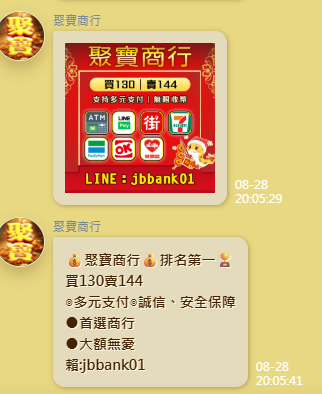 玩家通常會透過社群、遊戲聊天室或朋友介紹取得幣商資訊,如圖所示,「聚寶商行」為其中一個例子。幣商會標榜「買130賣144」等匯率,吸引玩家加LINE聯繫,以塑造誠信與保障形象。對話初期幣商會確認以下幾項內容: