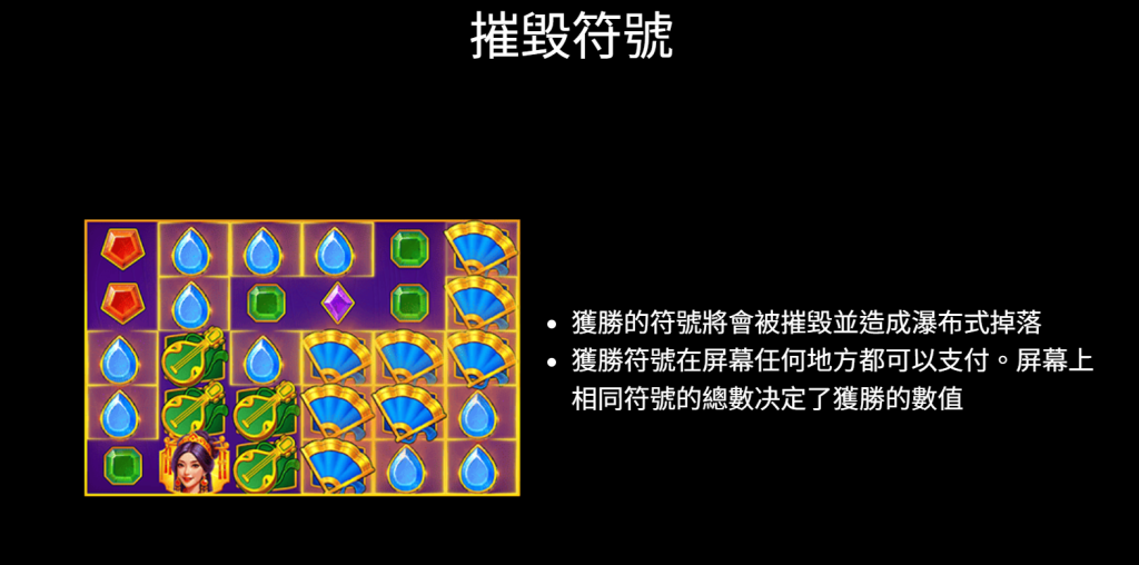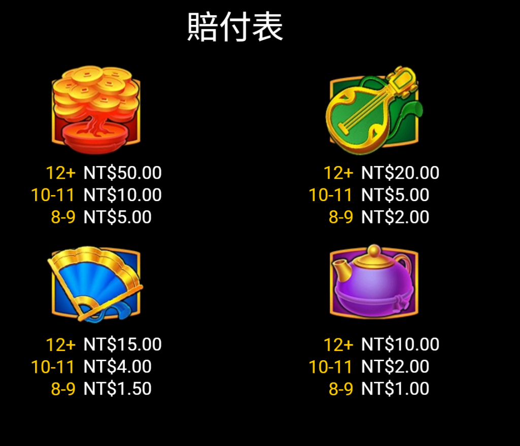 在賠付表中,高價值符號的代表是金幣樹、琵琶、摺扇與茶壺。這些符號不僅象徵東方文化中的吉祥與富貴,也在遊戲中帶來可觀的派彩。