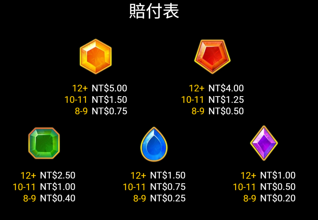 - 紫色菱形寶石:價值最低,12個以上也僅1元,但常常作為補線符號出現,增加盤面中其他高價值符號的連線機率。
