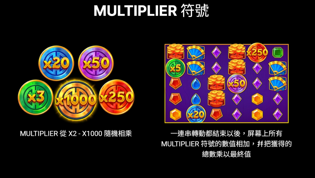 但在BNG電子-公主賞千金中,倍數符號直接出現在主遊戲過程。從x2到x1000的MULTIPLIER隨機出現,並且會在一輪符號崩落結束後相加,最後套用到總獲勝金額上。這意味著,即使是一般回合,也能因為倍數符號的出現而瞬間爆發。