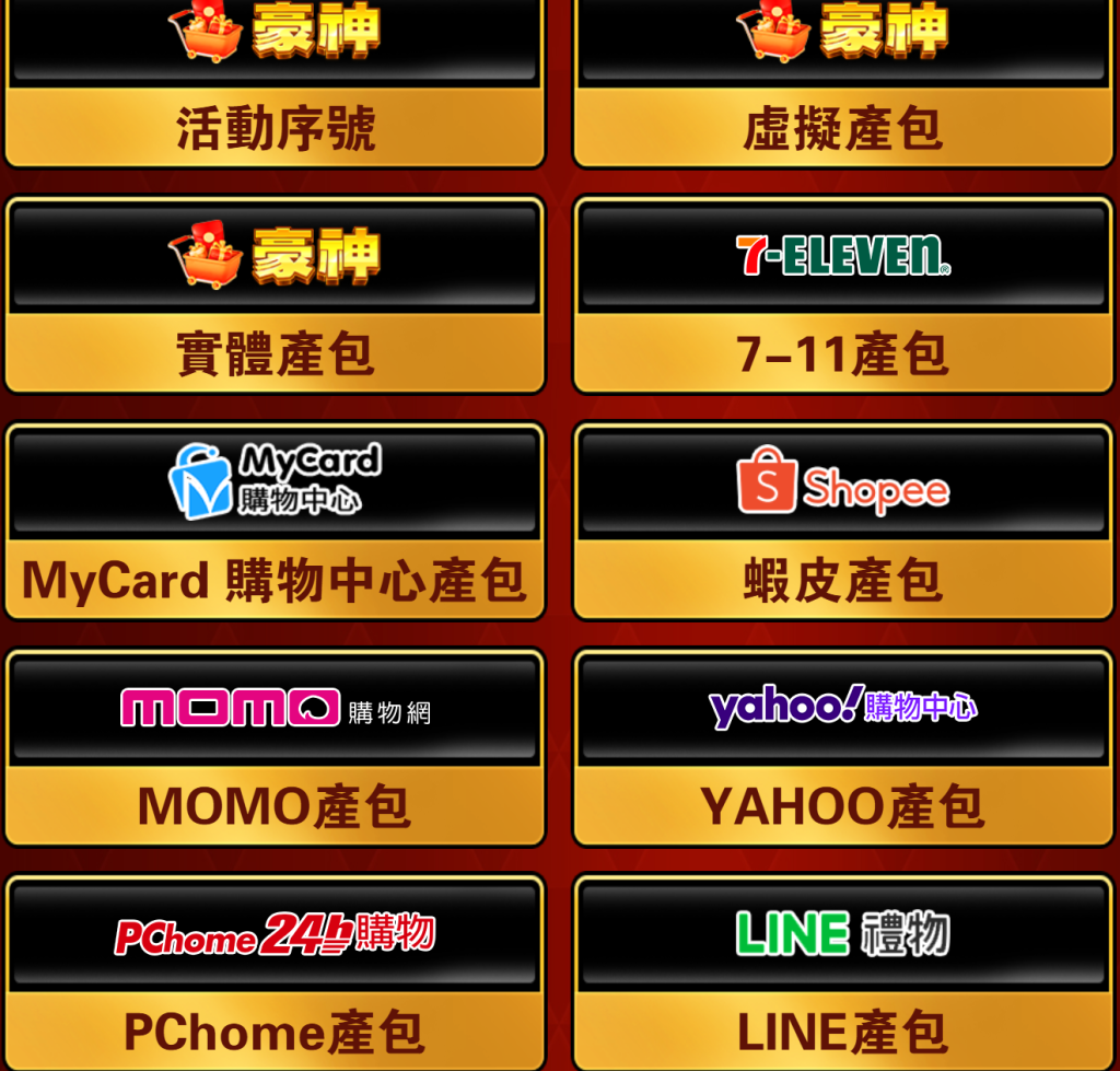 | MyCard/Momo/PChome等購物中心序號 | 網購買產包後附贈 | 否 | 否 | 會 |
