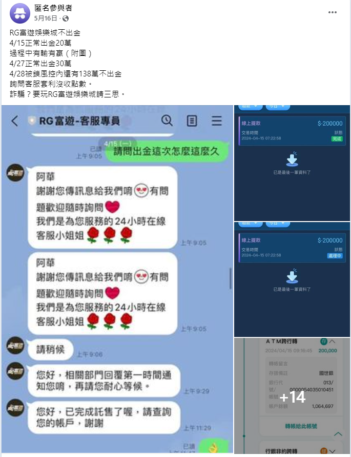 這位網友在4月15日的時候,正常地從富遊娛樂城提領了20萬元,這個過程中他描述道,雖然輸輸贏贏,但整體來說出金算是順利的。這筆金額並不算小,對於一個玩家來說,能夠成功提領已經算是比較理想的情況。之後的4月27日,他再度提領30萬,也同樣順利出金。兩次的出金經驗讓這位網友對富遊娛樂城的信任度提高了,認為這是一個可靠的平台。