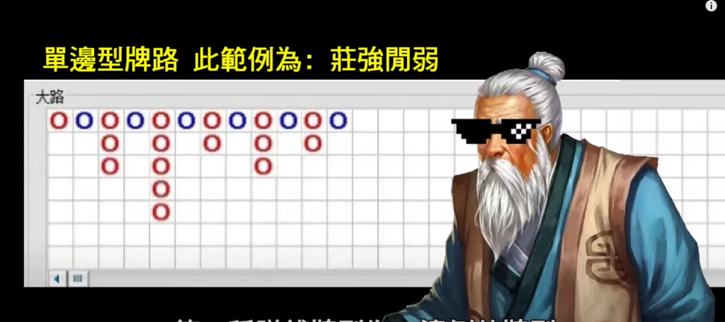 單邊型牌路的特徵是長時間連續出現同一邊的結果,這類型在百家樂中經常出現,圖中展示的例子就是「莊強閒弱」,莊家連勝多局,間隔一局才出現閒家。