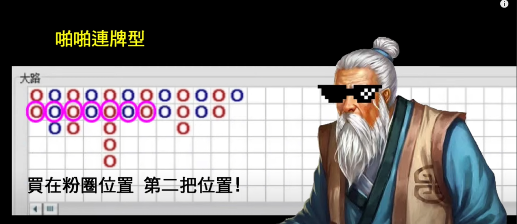 對於啪啪連牌型,玩家可以在看到連勝開始時迅速跟進下注,尤其是在第二局位置進場,因為這是連勝初期的黃金時刻。圖中粉色圓圈所標示的區域就是建議的進場點。這類牌型需要玩家反應快速並果斷下注,以在連勝尚未結束前賺取獎金。若是連勝中斷,可以立刻收手觀望,以免因錯誤判斷而損失過多。