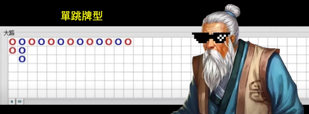 單跳牌型是一種規律性強的跳動型牌路,即莊家和閒家輪流獲勝,交替出現。圖中的例子明顯展現了這樣的牌路,每次莊家和閒家都隔一局出現,看似彼此不連續,但其實隱藏了規律。