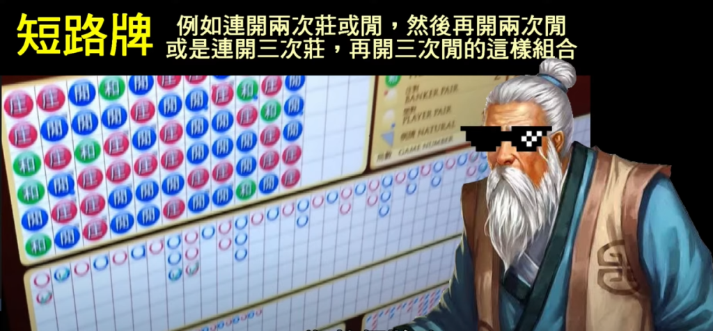 短路牌型通常是兩次或三次連勝交替出現,例如圖中展示了連開兩次莊或閒,然後切換到對方兩次,或者連開三次莊再連開三次閒。這種牌型看似隨機,卻隱藏著連勝與切換的節奏。