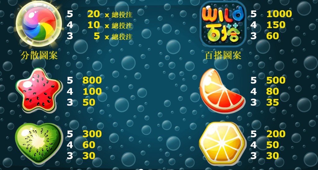 高價值圖案包括星形西瓜、橘子和奇異果等水果圖案,分別對應的最高賠付為800倍、500倍和300倍。我認為這些符號的設計不僅增加了遊戲的視覺趣味性,還給玩家帶來了豐富的收益期待。尤其是西瓜圖案的高額賠付,極大地提高了遊戲的吸引力。