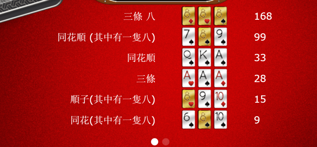 我覺得這款遊戲最大的亮點在於多樣化的賠付機制,無論是高風險高回報的三條八,還是中等回報的順子與同花,都能讓玩家根據自己的策略做出選擇。此外,賠率設計十分透明,我認為這讓玩家在投注時更加安心。
