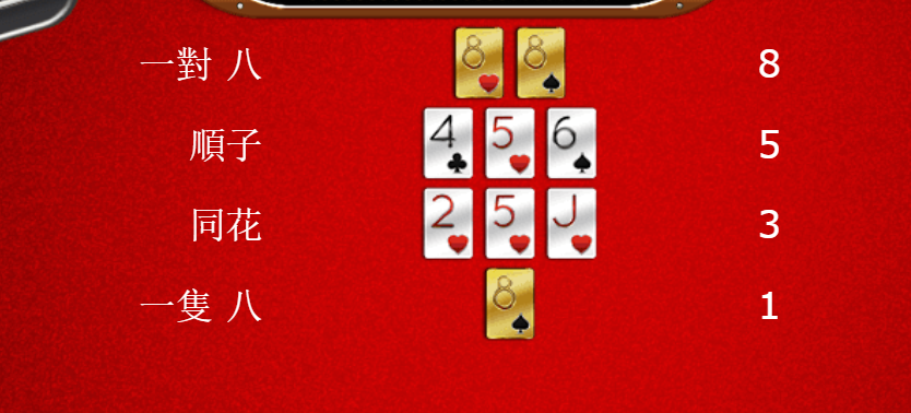 • 順子(包含一雙八)的賠率是15倍,這是一個中等回報的組合,對於新手玩家來說可能更容易追求。