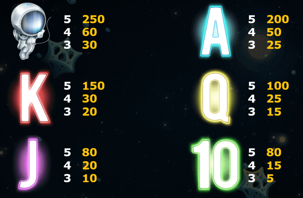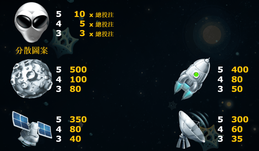 高價符號如「月球」和「火箭」的賠付顯得非常慷慨。在獲得5個「月球」圖案時,玩家將贏得500倍投注額,這對於期待高風險高回報的玩家來說無疑是一個巨大的吸引力。同樣,「火箭」符號也提供了高達400倍投注額的回報,配合遊戲整體的外星主題,賦予玩家如火箭般升空的贏取快感。
