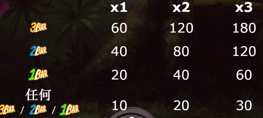 3 BAR、2 BAR、1 BAR的設計為《古怪猴子》增添了更多趣味性和期待感。當玩家湊齊三個3 BAR時,可獲得最高180倍的賠付,與其他BAR符號的混合搭配也能帶來20到60倍不等的回報。我覺得這讓遊戲的變化性增加,讓玩家不會感到單調。