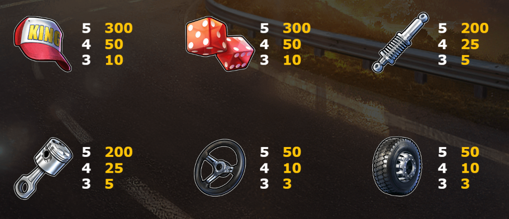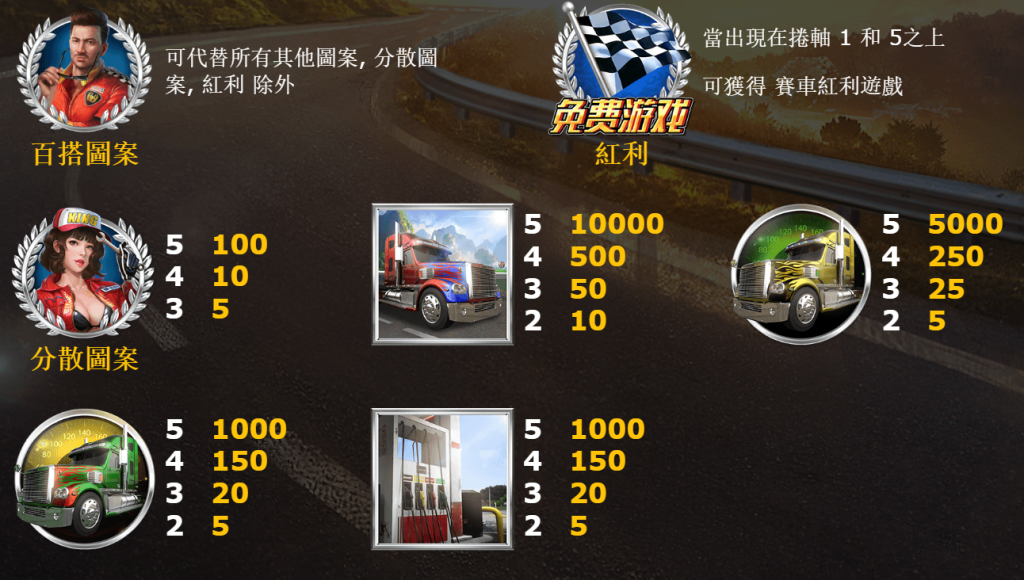 這款遊戲擁有多樣的符號設計,例如卡車、方向盤、加油站、骰子以及代表速度的計速器等,每一個圖案都充滿了速度感與挑戰意味。最具吸引力的是WILD和BONUS符號,能幫助玩家快速進入大獎模式。此外,玩家還可以通過觸發特定符號組合,獲得更多免費遊戲機會。
