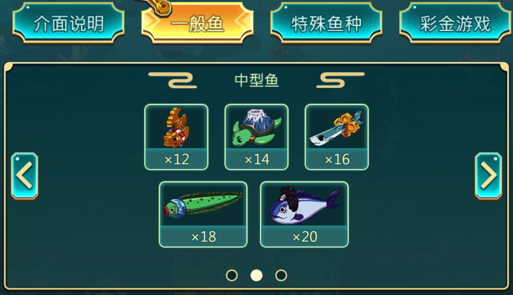 中型魚的賠付倍數範圍從12倍到20倍,如龜、長魚與寶劍魚等,捕捉難度相較小型魚有所提升。我覺得,中型魚是遊戲中承上啟下的重要環節,玩家需要通過精準射擊和適當的投注來最大化收益,這部分的挑戰也增添了遊戲的策略性。