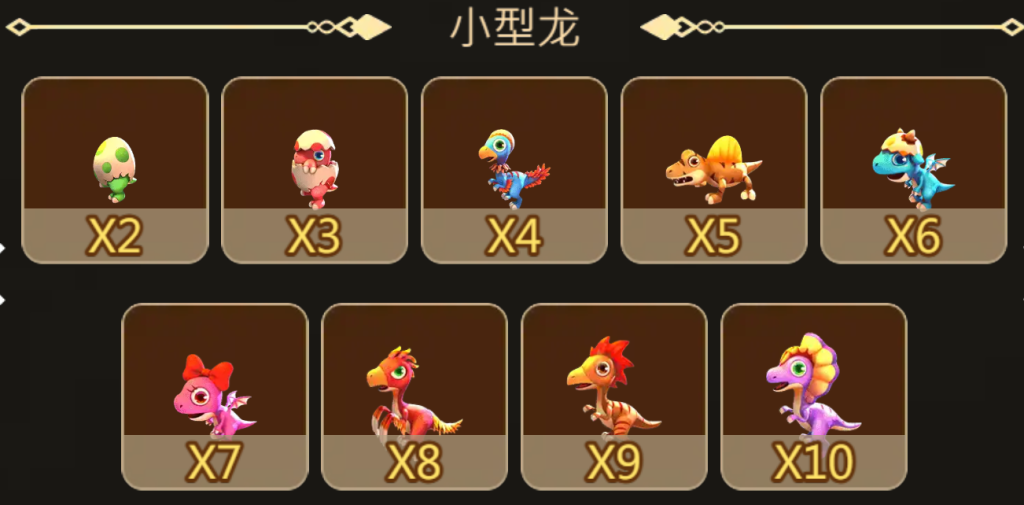 小型龍的分類從倍率最低的2倍到最高的10倍,這部分主要適合新手玩家或希望穩定收益的玩家。我覺得小型龍的設計非常可愛,像恐龍蛋和剛孵化的小恐龍,外型俏皮,擊敗它們的過程充滿了趣味。這些恐龍對應的倍率較低,但出現頻率高,適合初步熟悉遊戲機制的玩家。