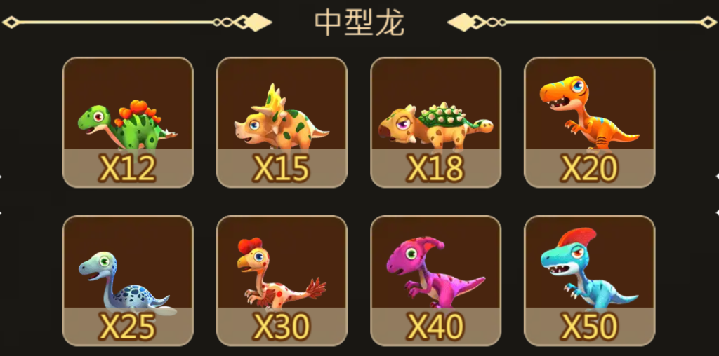中型龍則是遊戲的中堅力量,倍率範圍在12倍到50倍之間。像劍龍和三角龍等經典恐龍角色,無論是外觀還是挑戰難度,都比小型龍更具吸引力。我認為這一部分的設計充滿了層次感,玩家需要更多的策略和操作才能擊敗它們,對應的回報也更豐厚,給人一種成就感。
