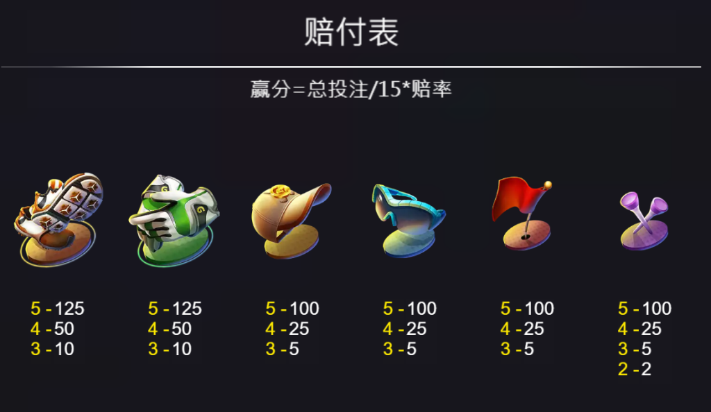在賠付表中,金色高爾夫球與白色高爾夫球的價值最高,五連線賠率均高達750倍,是玩家爭取高額獎勵的主要目標。而高爾夫球車的賠付次高,五連線可獲得400倍賠率,同樣吸引了玩家的目光。其他如高爾夫袋與球桿的賠率雖略低,但五連線仍能提供250倍的回報。我認為這些高賠付符號為玩家提供了追求大獎的誘因,增添了遊戲的吸引力。