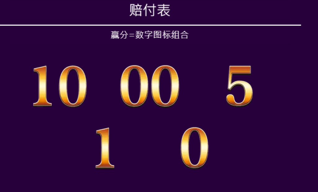 賠付表中展示了多種金色數字的排列組合,如10、00、5、1等,每個數字都散發出華麗的金光,讓人直觀感受到它的價值感。這些數字不僅僅是裝飾,它們是玩家的目標——每次轉動後,當某些數字成功排列時,就意味著獎勵的到來。