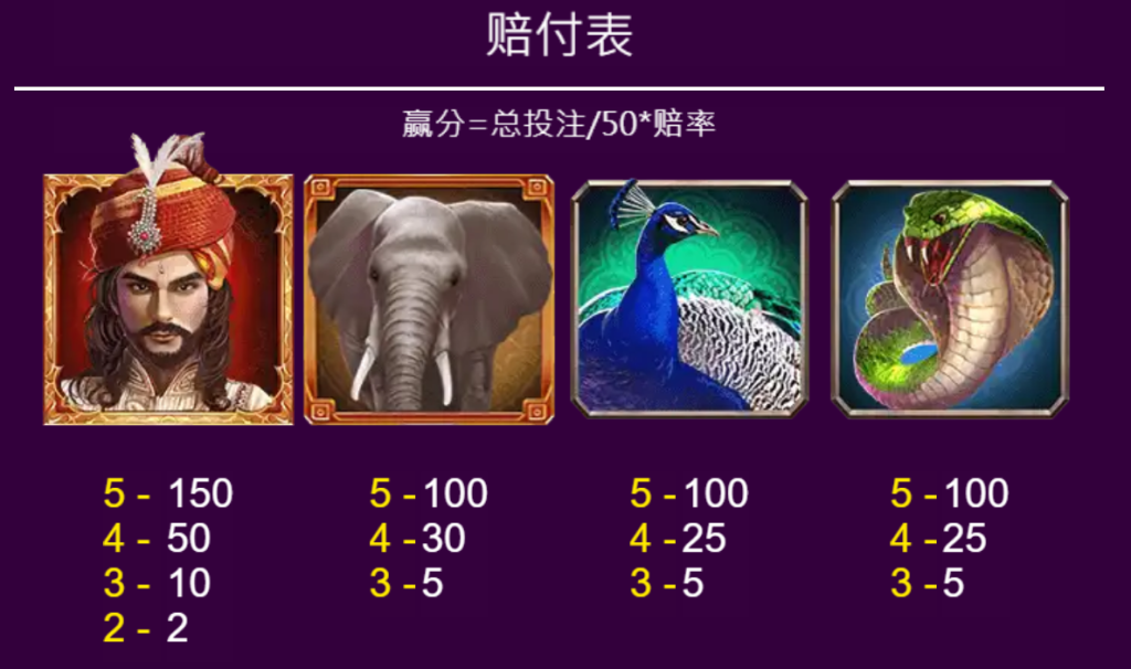 《印度神虎》的賠付表通過紫色背景搭配金色邊框,營造出奢華而神秘的皇家氣息,每個符號的設計細膩且充滿異域風情,例如孔雀羽毛的閃耀光澤與眼鏡蛇的動態姿態,讓人感受到遊戲對細節的用心。我認為這樣的視覺設計不僅提升了遊戲的沉浸感,也加深了玩家對印度文化的印象。