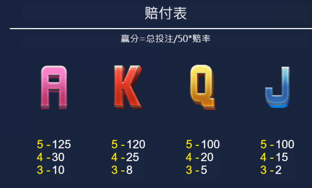 遊戲中還設計了一些中低價值符號,如撲克牌符號A、K、Q、J,這些符號的賠付範圍從125倍(A符號5連線)到100倍(J符號5連線)不等。我認為,這些符號的存在,讓玩家在未能觸發高額賠付時,依然能保持穩定的回報,適合長時間的遊戲體驗。