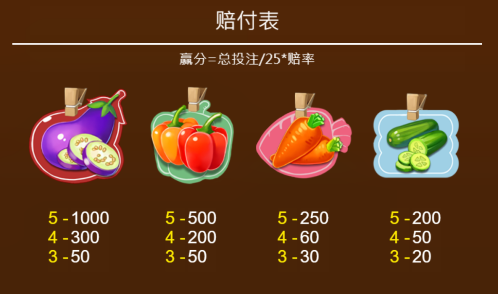 《蔬香人家》的賠付圖讓人感覺設計得十分用心,既簡單直觀,又清晰地展示了各個圖案對應的獎勵倍數。我認為這樣的設計很貼合玩家需求,尤其是在遊戲過程中,玩家可以快速地參考賠付數據,進行合理的策略規劃。