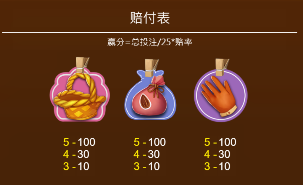 低價值的圖案包括籃子、種子袋和手套,五連時的賠付倍數均為100,四連和三連的倍數則較低。我認為這樣的設置合理地分配了遊戲中的價值權重,讓玩家不至於因為多次出現低價值圖案而失去興趣。特別是籃子和種子袋,雖然它們的賠付相對較低,但在遊戲中出現的頻率高,能夠給玩家帶來穩定的小額獎勵,這也增加了整體遊戲的平衡性。