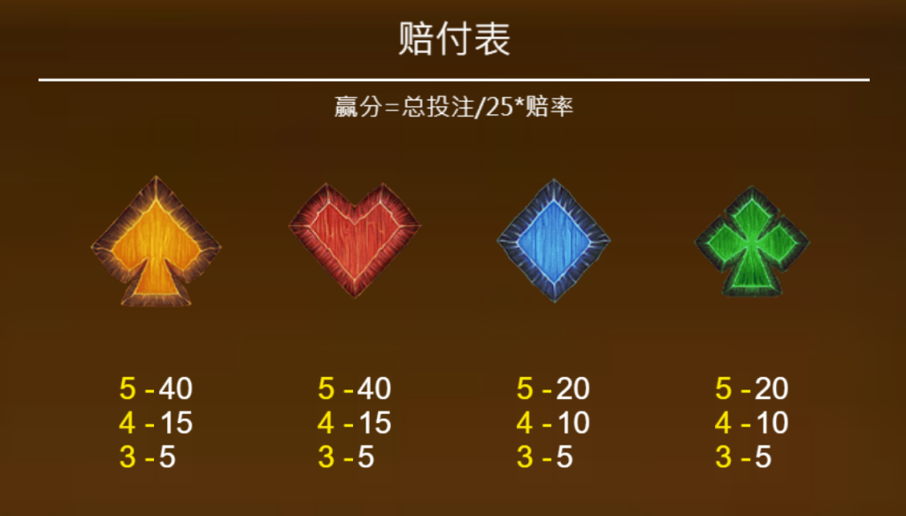 低價值符號則由撲克牌的花色組成,包括黑桃、紅心、方塊與梅花。這些符號的五連賠付在20至40倍之間,儘管獎勵較低,但它們的出現頻率較高,能為玩家提供持續的贏分機會。我覺得這樣的符號設計不僅延續了傳統遊戲的元素,也為玩家提供了更多的投入回報平衡。