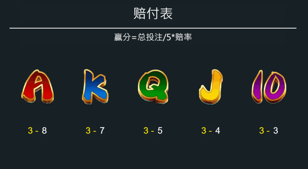 除了主題符號,遊戲中還包含了A、K、Q、J、10等字母與數字符號,它們的賠付倍數相對較低,例如A符號的最高賠付為8倍,而10符號則為3倍。我認為這些符號的設計,雖然賠付不如主題符號高,但在遊戲中起到了填充畫面、提升中獎機率的作用,為玩家提供了更多小獎勵的機會。