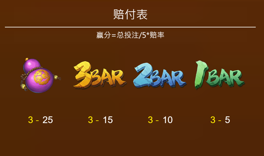 低賠付符號部分,像是紫色葫蘆和「BAR」類型圖案,我認為這些設計讓遊戲更加層次分明。紫色葫蘆的 25 倍賠率雖然不算高,但足以為玩家提供穩定的回報。而「3BAR」、「2BAR」和「1BAR」符號,分別對應 15、10 和 5 倍的賠率,我覺得這不僅增加了符號的多樣性,也降低了玩家在每輪中“空手而歸”的機率。