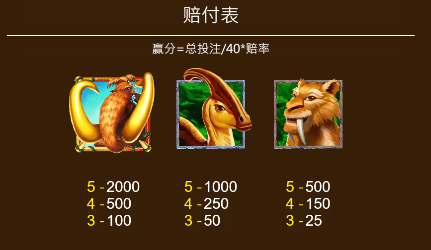 玩家應該注意到賠付圖中包含了三大高價值圖標,分別是猛瑪象、長冠龍以及劍齒虎。當玩家在遊戲中獲得五個相同圖標時,猛瑪象的賠付高達2000倍,長冠龍為1000倍,而劍齒虎也有500倍。我覺得這樣的設計不僅強化了遊戲的史前主題,也給玩家提供了極具吸引力的目標,特別是在追求高額回報的玩家眼中,這無疑是遊戲的一大亮點。