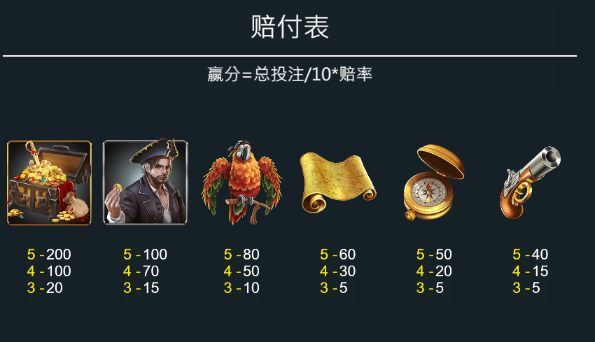 賠付表中的最高價值符號是裝滿金幣的寶箱,當玩家獲得五個寶箱符號時,可以贏得200倍的獎金。這是遊戲中的終極獎勵,彷彿在茫茫大海中找到了一個未被發現的財富寶藏,讓人心跳加速。