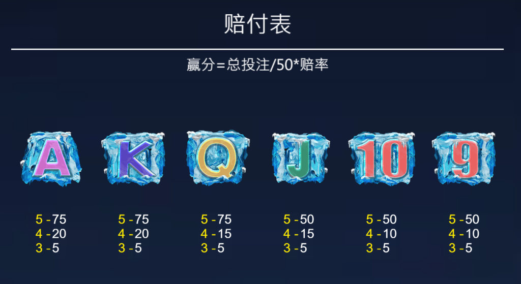 除了高額獎勵的野獸符號外,《餓狼傳說》也設計了低賠付的冰雪字母和數字符號,包括A、K、Q、J、10、9。這些符號雖然賠付較低,但出現頻率非常高,能為玩家提供穩定的小額回報,讓籌碼不斷積累: