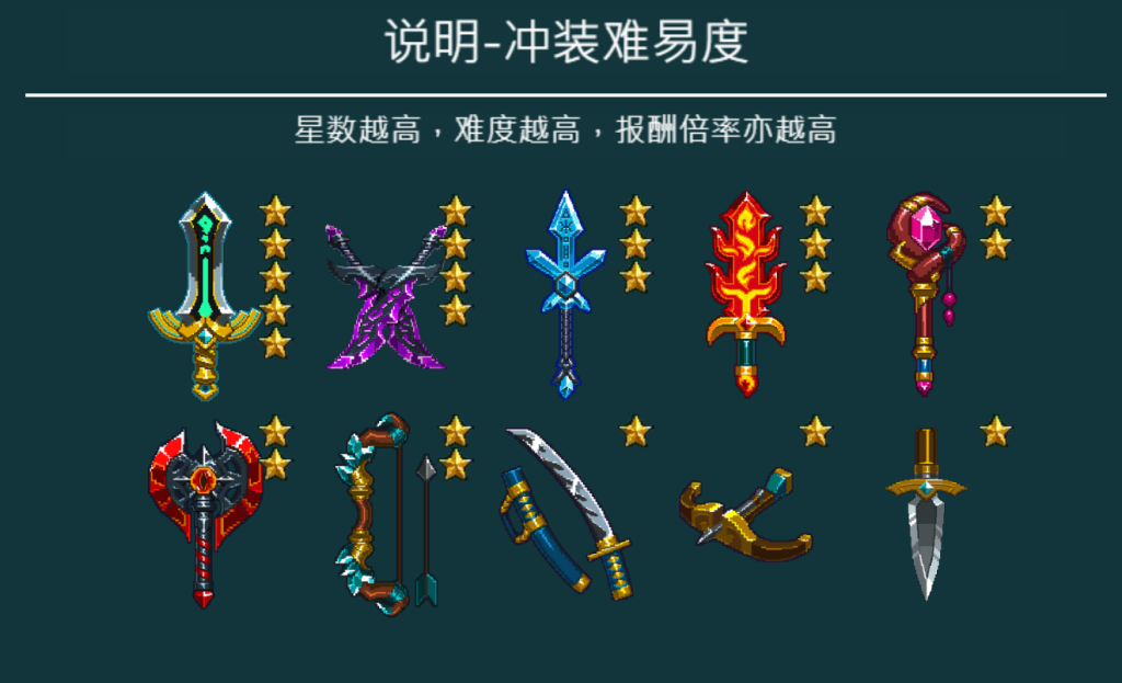 《沖裝啦》的賠付與武器的「星級」密切相關。每件武器都有對應的星數,星數越高,強化的難度越大,但相對的,回報倍數也越高。比如一把高星級的武器經過多次成功強化後,能帶來非常可觀的回報,我認為這樣的設計非常吸引那些喜歡冒險的玩家。