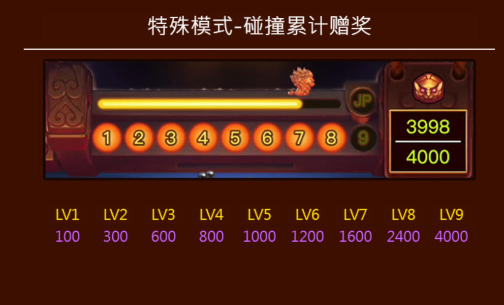 《雙獅戲珠》的彩金遊戲分為兩大部分:JP得分區累計進度與彩金燈號獎勵。