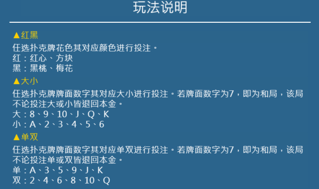 - 紅黑:根據牌的花色來預測紅(紅心、方塊)或黑(梅花、黑桃)。