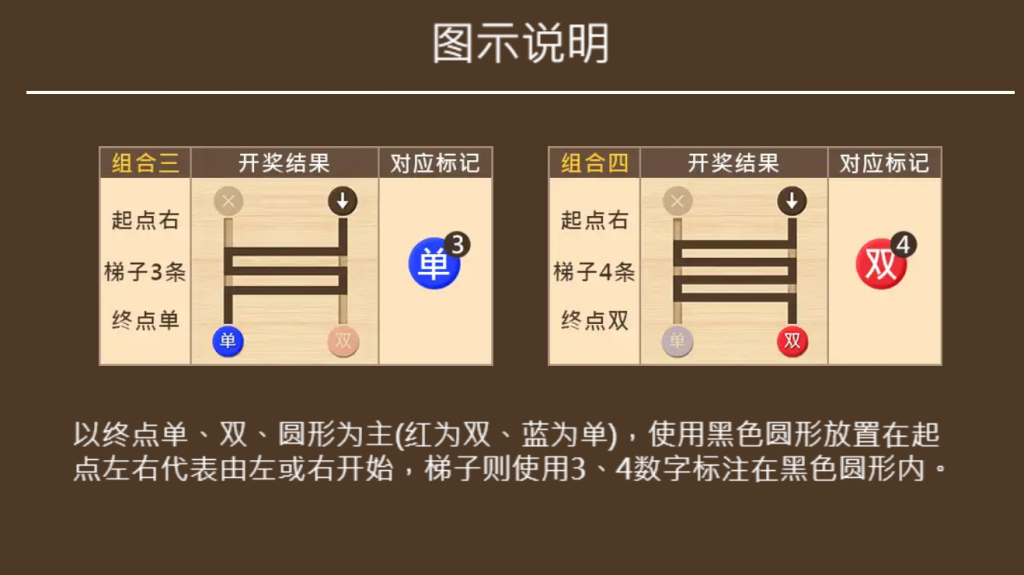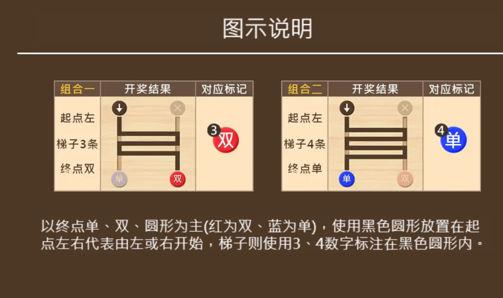 每局遊戲開始時,玩家需在“單”與“雙”兩個終點,以及左、右兩個起點中做出選擇。梯子的數量會隨機生成,從而構成不同的通道網絡。舉例來說,若選擇“左起點”和“單終點”,遊戲將根據梯子結構模擬路徑,並最終給出結果。在遊戲中,紅色代表“雙”,藍色則表示“單”。玩家需要根據自己的預判,選擇正確的終點來獲得豐厚的回報。