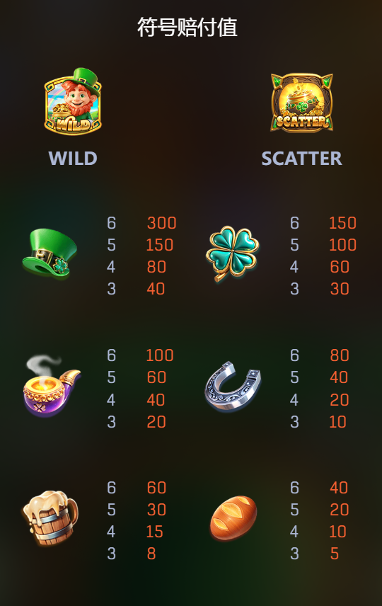 在角色符號方面,精靈帽與四葉草象徵著愛爾蘭的傳統文化,而煙斗與馬蹄鐵則是幸運的象徵,當匹配6個相同符號時,最高可獲得100倍到300倍不等的賠付。我覺得這樣的設計不僅提升了遊戲的文化氛圍,也讓玩家在追求高額獎勵的同時感受到故事背景的深度。