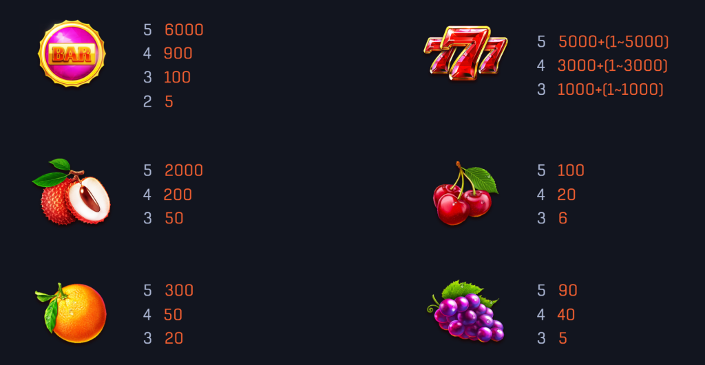 遊戲的水果符號如荔枝(最高2000倍)、橙子(最高300倍)和西瓜(最高200倍)等,代表著中階的賠付回報。這些符號不僅頻率較高,還提供了穩定的獎勵來源。我覺得這種設計平衡了高風險與低回報,適合新手玩家和追求穩定收益的玩家。