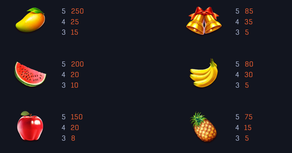 低價符號如櫻桃(最高100倍)、香蕉(最高80倍)和鳳梨(最高75倍),雖然賠付相對較低,但頻繁出現的特性讓它們成為玩家累積資金的基石。這些符號的存在,讓玩家即使在未中大獎的情況下,仍能維持一定的遊戲節奏。我認為,這是對玩家體驗的細緻考量,讓遊戲更具包容性。